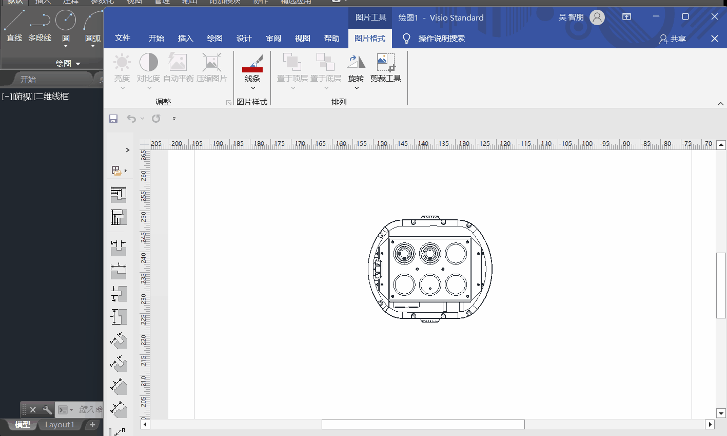 在 Visio 中,可将复制到 CAD 图形当成一个对象,双击还可进入 CAD 中进行编辑